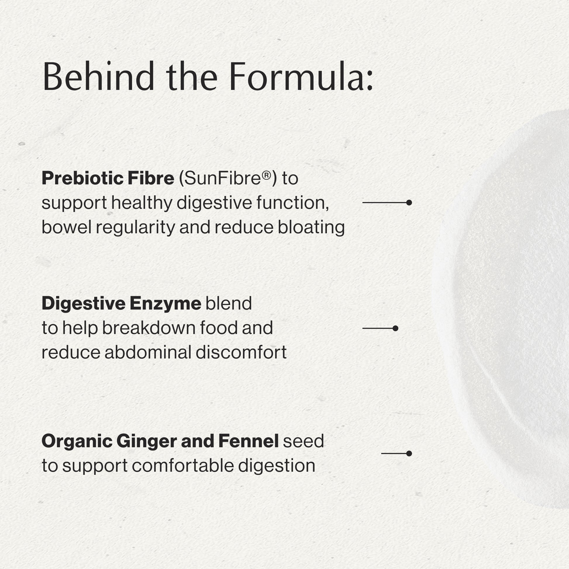 Feel lighter, less bloated, and more comfortable after meals with this gentle daily blend of prebiotic fibre, digestive enzymes, and soothing botanicals.